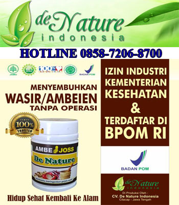 Bagaimana mengobati Ambeien itu sendiri. pengobatan yang terbaik untuk Ambeien adalah dari luar dan dalam sehingga Ambeien benar-benar tuntas dan tidak akan kambuh lagi. obat Ambeien terbaik �AmbeJoss dari De Nature� Adalah Obat wasir alami manjur yang memang terbaik untuk mengobati Ambeien, dan sudah terdaftar di badan obat dan makanan (BPOM) dengan nomer registrasi POM TR: 133 374 041 . terbuat dari bahan alami antara lain terdiri Daung Ungu, Mahkota Dewa dan Kunyit Putih.